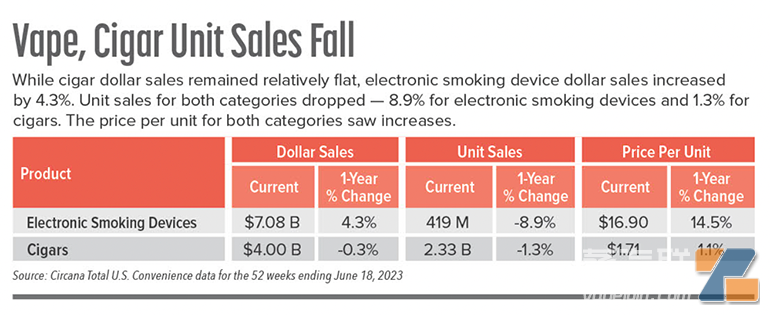 销售额增长4.3%,销量下降8.9%,美国便利渠道电子烟兴起涨价潮核心提示:据美国零售媒体消息,随着 FDA 加强对于电子烟的监管力度,以及是否禁止口味雪茄的决策即将在今年秋季公布,便利店运营商正在重