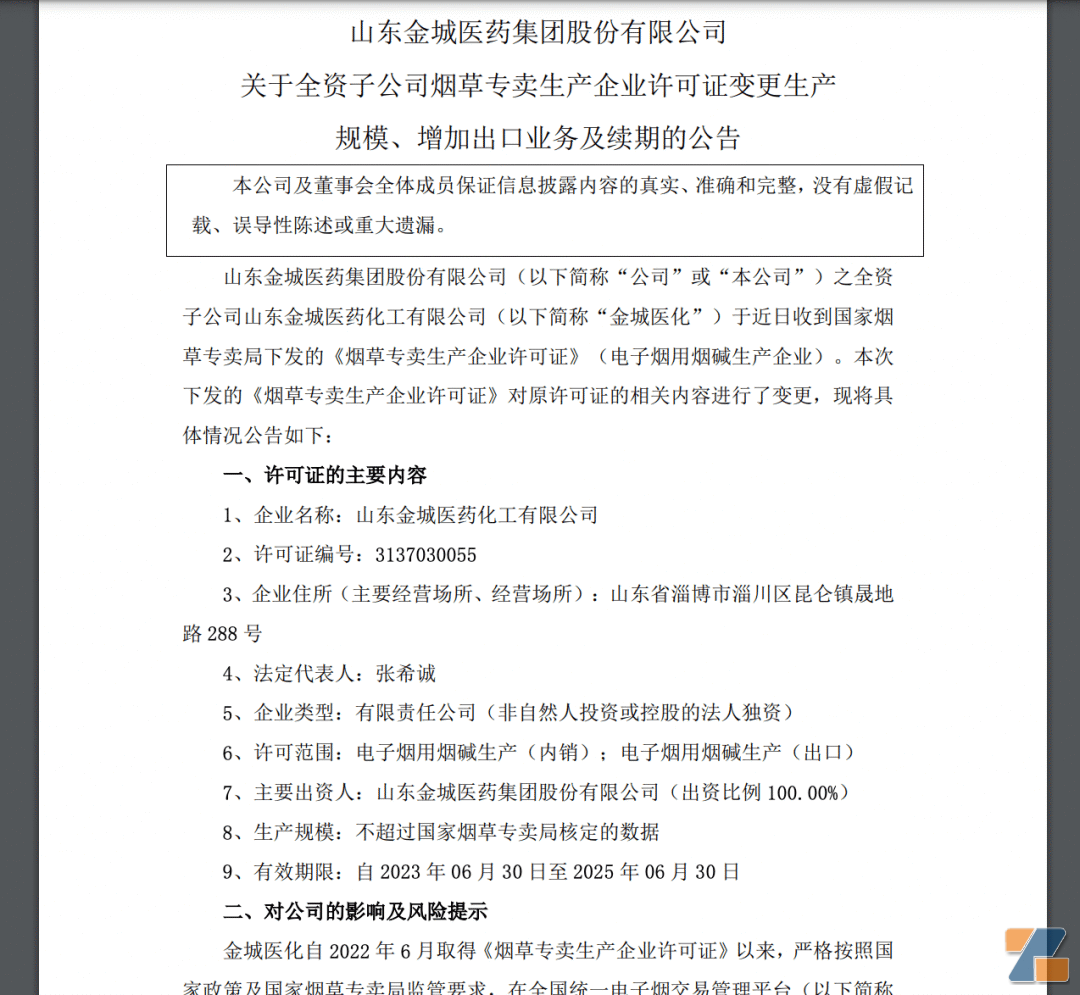 金城医药:许可证已变更,可从事电子烟用烟碱出口核心提示:金城医药7月16日公告,公司之全资子公司山东金城医药化工有限公司于近日收到国家烟草专卖局下发的《烟草专卖生产企业许可证》(