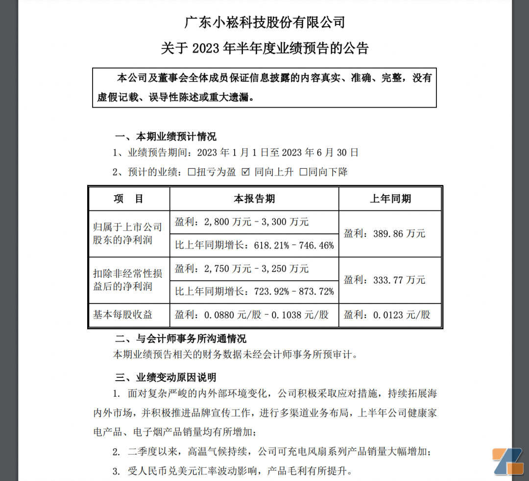 小崧股份净利润同比增长超618%,电子烟销量增加为主因核心提示:小崧股份于7月15日发布《关于2023 年半年度业绩预告的公告》,报告期内公司预计实现归属于上市公司股东的净利润2800万元到3300万