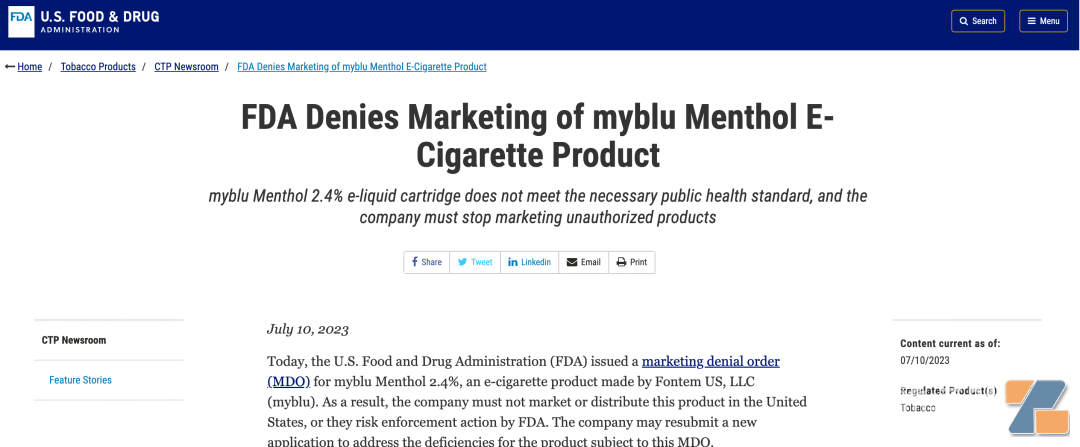 突发!FDA要求帝国烟草下架myblu电子烟,涉及分销与零售核心提示:FDA官网于7月10日发布《FDA Denies Marketing of myblu Menthol E-Cigarette Product》新闻稿,其中提到FDA已对 Fontem US, LLC